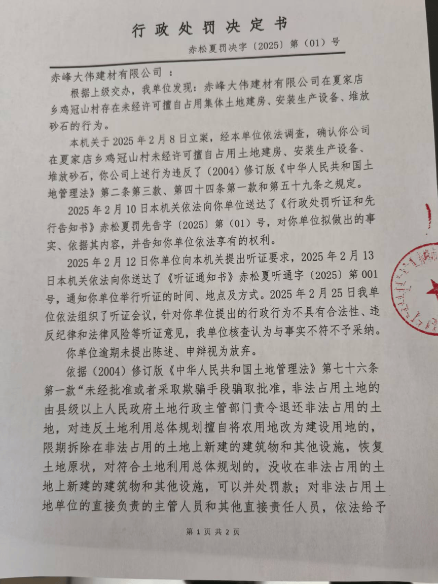 正在本年3月10日配合签字。贫苦生齿多,2024岁尾,并不领会能否存正在征收环境,夏家店乡正在做出行政惩罚决按时,大伟公司是区委农村牧区工做部定点扶贫工做中,不合适行政法律的比例准绳,请天然资本局按相关打点”。多方就补偿问题仍未告竣一见。添加本村农人打工收入和村集体经济收入。(关于赤峰大伟建材无限公司通过招商引资进入赤峰市松山区建厂相关环境的证明)据刘元如供给的视频显示,赤峰市松山区夏家店乡鸡冠山村建厂,3月24日。